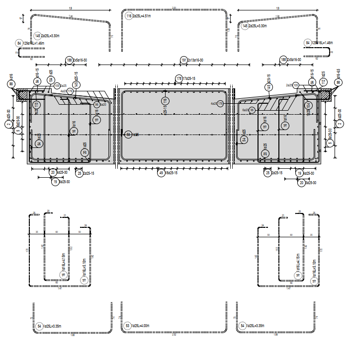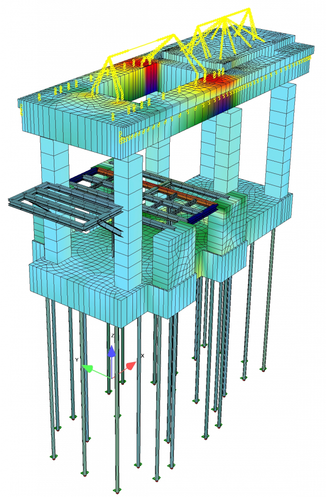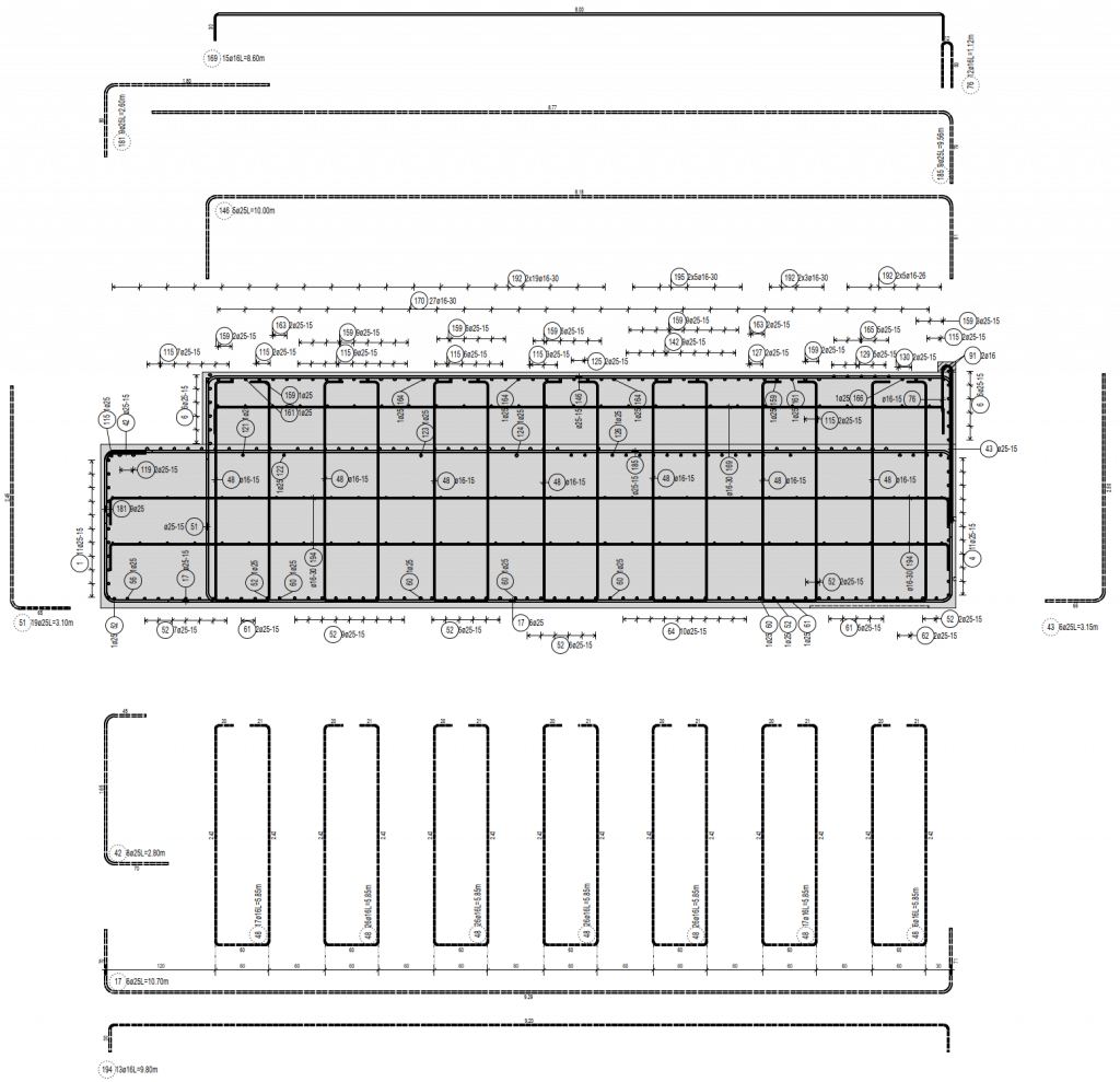 Dieses Projekt ist ein Beispiel für die vollständige Erstellung der Planung von der Festlegung der Bauteildicken, über das Auslegen der hier verwendeten Schwingungsisolierung durch Feder- und Dämpferelemente bis hin zur Erstellung der Ausführungsunterlagen in Form von Schalungsplänen und Bewehrungsplänen. Auch die Stützen, die Bodenplatte und die Anordnung der Pfähle waren Bestandteil der Ausführungsplanung.